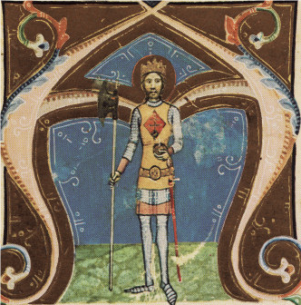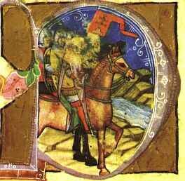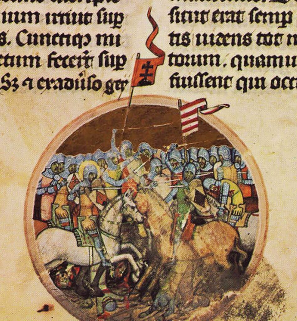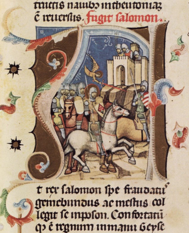 Prenasledovanie uhorského kráľa Šalamúna, ktorý v rukách drží štít so znakom Zadunajska svätým kráľom Ladislavom I., ktorý má na štíte znak Nitrianska/Preddunajska. Na obrázku vpravo ten istý kráľ s nitrianskym znakom na tunike. Zdroj: Obrázková kronika (druhá polovica 14. storočia).