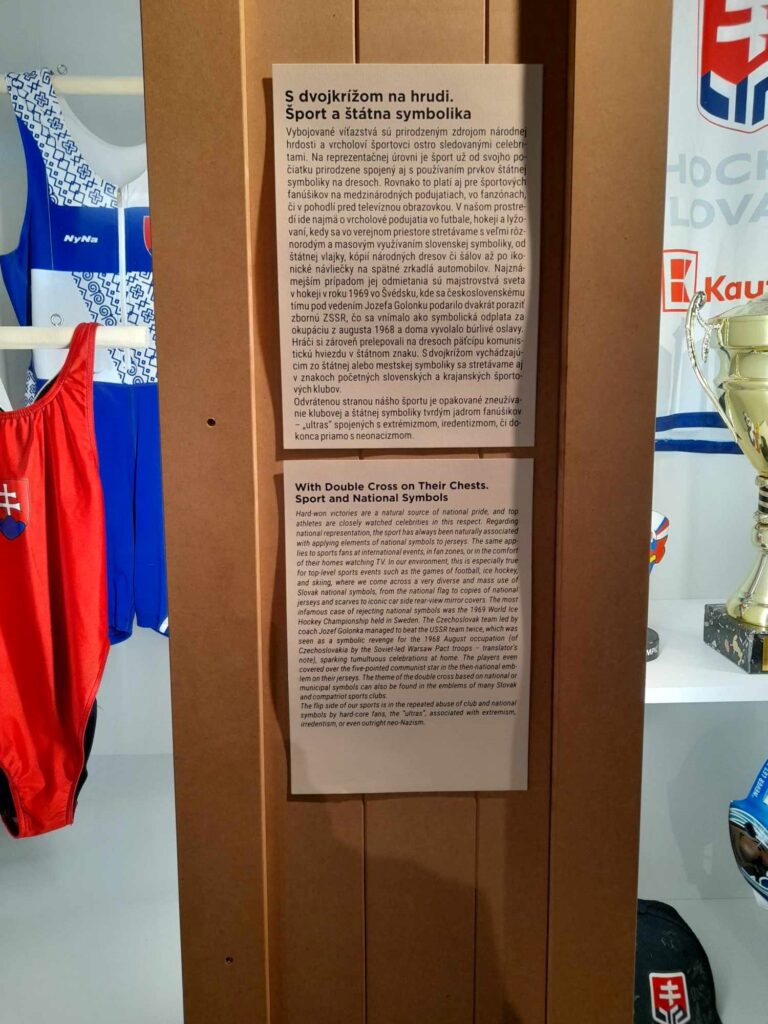 Keď už som sa rozpísal o tom, o čom všetkom výstava nehovorí, v čom sa jej kurátori mýlia, a čo tu chýba; tak pre úplnosť treba pripomenúť, že v januári na výstave jednoducho absentovala aj veľká časť popisov exponátov. Postupne ich doplnili. Kurátorom výstavy týmto vyjadrujem plné pochopenie. Viem si predstaviť, aké je ťažké urobiť popis k štátnemu znaku, ktorý je umiestnený na nejakom citlivom mieste, povedzme na prsiach ženských plaviek. Toto zvládli už v januári.