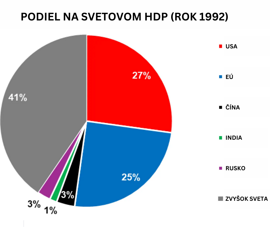 Navyše je pozoruhodné, že ani z ekonomického hľadiska nestráca Amerika ani zďaleka dych, výkonnosť a výtlak, ako by sa mohlo zdať z diskusií v médiách a na sociálnych sieťach. Ak sa pozrieme na posledné tri desaťročia, podiel Spojených štátov na svetovej ekonomike sa zmenil len relatívne veľmi málo v porovnaní s výrazným poklesom Európskej únie, ktorá až do brexitu stále len expandovala. Škoda, že Amerika a jej priatelia to všetko prestali vidieť, alebo to vidieť nechcú (pozri grafy).