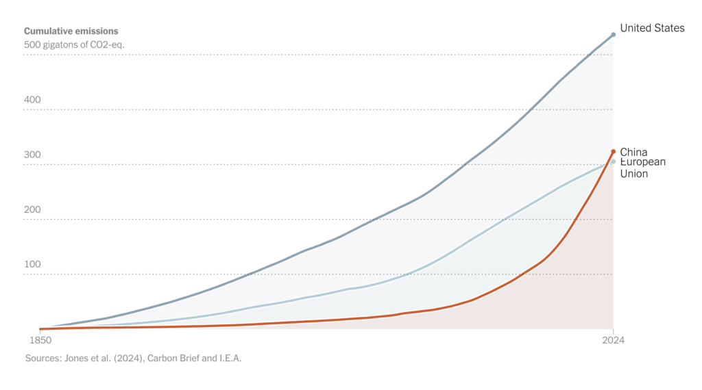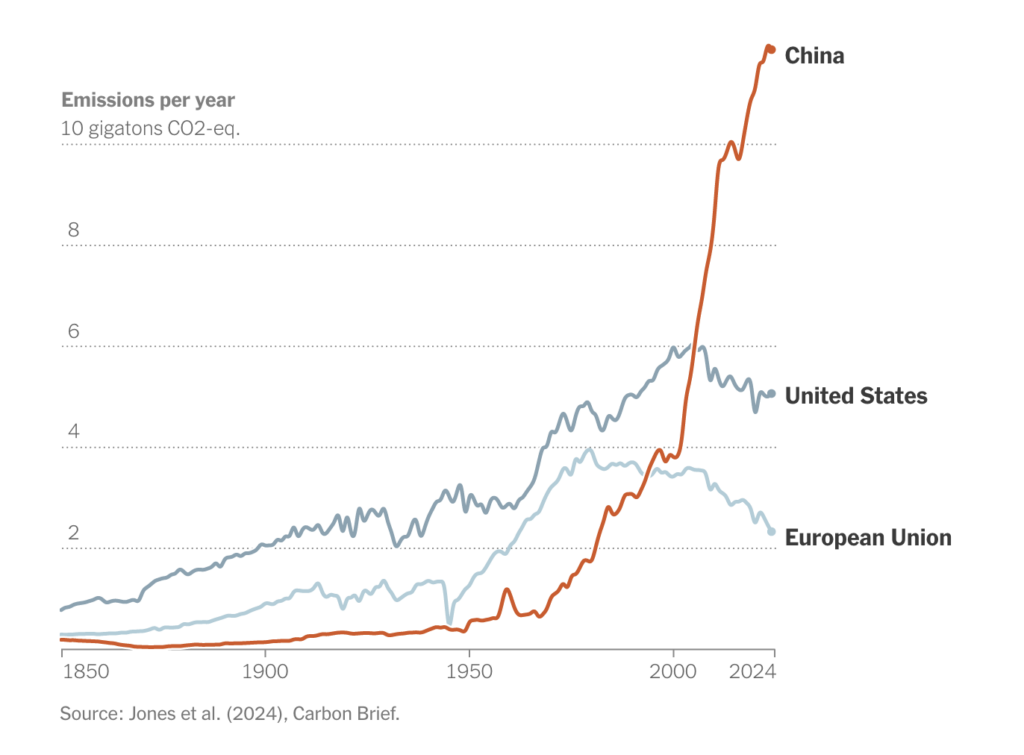 Spojené štáty od 19. storočia vypustili do atmosféry viac celkového znečistenia, ktoré otepľuje planétu, čiastočne preto, že krajina dlhšie spaľuje uhlie, ropu a zemný plyn. Čína ich však rýchlo dobieha.