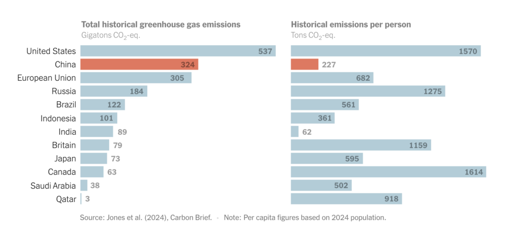 Keďže Čína má 1,4 miliardy obyvateľov, jej historické emisie na obyvateľa sú stále nižšie ako v Spojených štátoch, Európskej únii, Japonsku a Kanade.