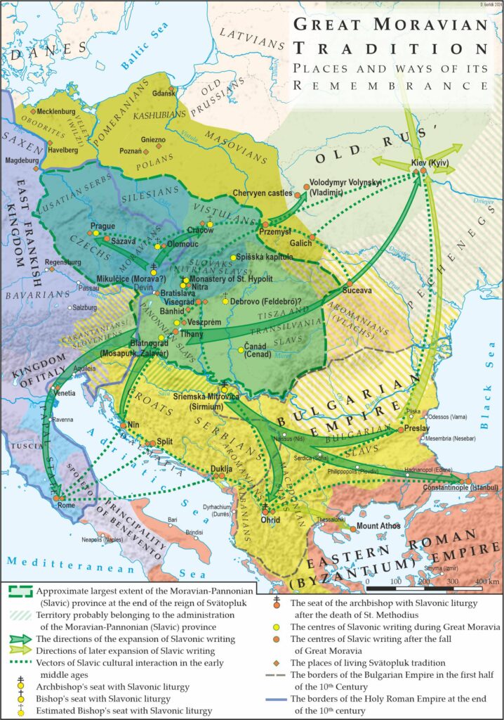 Ktorá z dnes známych veľkomoravských lokalít bola stolicou svätého Metoda však ťažko povedať. Malá terminologická zmena však mala mať ďalekosiahle následky. Územia nad Dunajom boli vyňaté z právomoci Pasovského biskupa a zverené Moravskému arcibiskupovi. Zadunajské územia zostali v správe arcibiskupa v Salzburgu. A Moravsko-panónskemu arcibiskupstvu sa otvorila cesta k evanjelizácii rozsiahlych, doteraz stále pohanských priestorov severovýchodnej Európy. Účinným nástrojom k tomu mala byť staroslovienčina.