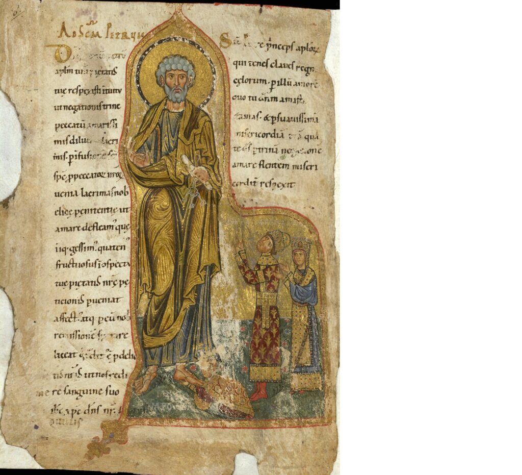 Hore na obrázku je v nadživotnej veľkosti svätý Peter, pri jeho nohách leží modliaca sa kňažná Gertrúda, manželka kyjevského veľkokniežaťa Izjaslava Jaroslaviča. Pri nohách svätého Petra stojí knieža Jaropolok Izjaslavič so svojou manželkou Kunigundou (Irenou) Meisenskou (f. 5v). Dole je symbolicky znázornená kráľovská korunovácia kniežaťa Jaropoloka a jeho manželky. Korunovácia sa deje prostredníctvom rúk svätého Petra a svätej cisárovnej Ireny (f. 10v).