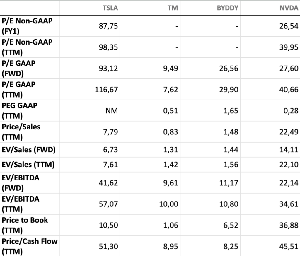 Hoci sa tieto čísla neustále trochu menia, ak by sa Tesla oceňovala ako tradičná automobilka, napríklad Toyota Motors (TM), jej pomer ceny k zisku by musel klesnúť približne 10-krát. Inými slovami, trhová hodnota Tesly by sa musela scvrknúť zhruba na jednu desatinu alebo by musela začať generovať násobne vyššie zisky.