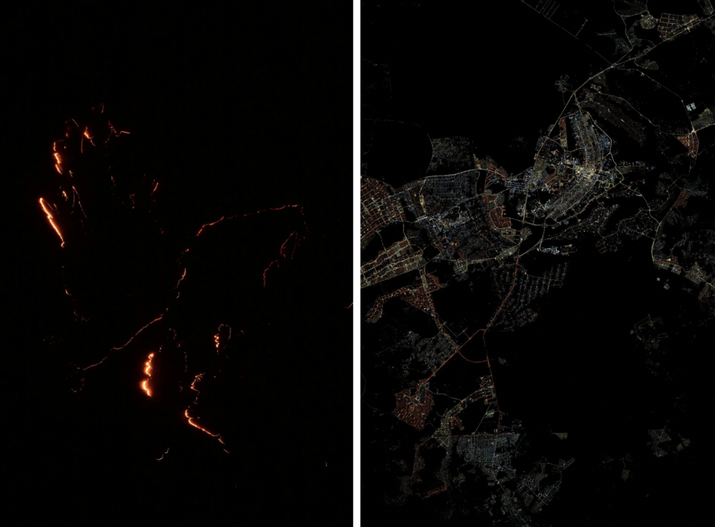 V noci svietia mestské aglomerácie, ako aj lesné požiare.