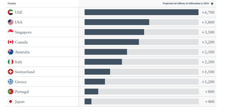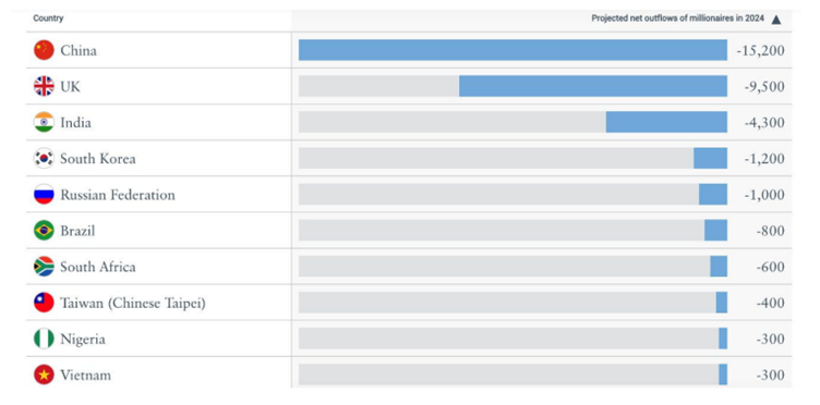Počet dolárových milionárov, ktorí sa presťahovali inam, vzrástol z 84-tisíc v roku 2022 na 120-tisíc v roku 2023. To je už viac ako pred pandémiou, pretože v roku 2019 tento počet predstavoval 110-tisíc. Odhady z júna 2024 predpovedajú, že do konca roka sa presťahuje približne 124-tisíc milionárov a v roku 2025 okolo 135-tisíc.