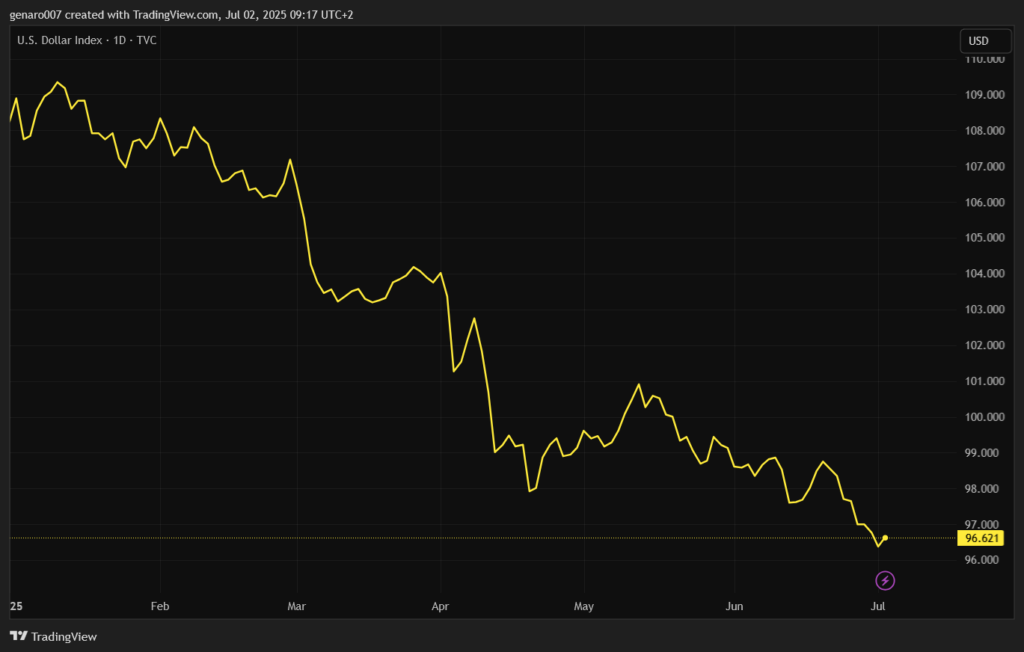 Kurz bitcoinu v poslednom období ťaží zo slabnúceho dolára. Dolárový index je od začiatku tohto roka v silnom zostupnom trende, čo kryptomenám pomáha. Nech už sa Trump 9. júla rozhodne akokoľvek, posilnenie amerického dolára je veľmi nepravdepodobné.