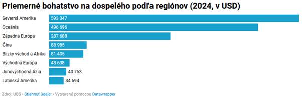 Ak by sme rozrátali osobné bohatstvo rovnomerne na počet obyvateľov, každému Američanovi by sa ušlo takmer 600-tisíc dolárov. V Oceánii je to najmä vďaka Austrálii bezmála pol milióna dolárov. Vo východnej Európe by sme pri prerozdelení bohatstva skončili každý s necelými 50-tisíc dolármi čistého majetku.
