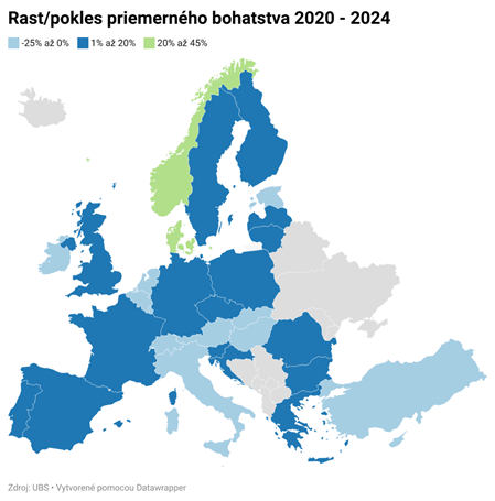Zatiaľ to znie ako dobrá správa pre Slovensko. Detailnejší pohľad však sklame. Slovensko patrí medzi tie európske krajiny, ktorých bohatstvo medzi rokmi 2020 až 2024 kleslo. Mohli by sme to zvaliť na pandémiu a energetickú krízu. Lenže to by sme medzi rastúcimi krajinami nemohli vidieť susedov z Česka a Poľska. A ani Bulharsko a Rumunsko či dva pobaltské štáty.